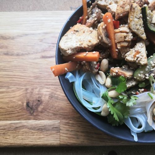 Das Gemüse kurz anschwitzen, die Nudeln mit dazugeben, die Soße darüber geben und alles vermischen. Abschmecken und alles auf 3 Teller aufteilen, (mit Tofu) Erdnüsse und den Kräuter garnieren. Guten Appetit.